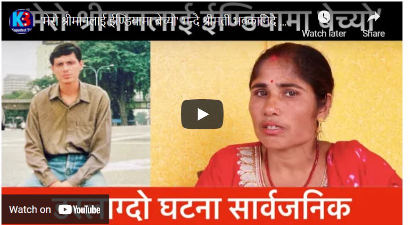 सँगै जिउने सँगै मर्ने बाचा गरी ७ फेरो लिएको पबित्र सम्बन्ध धन कमाउन परदेशि बन्नु पर्ने बाध्यताले सपनाहरु नै छताछुल्ल हुँदा कस्को मन रुदैन होला र कमाउन छिमेकी राष्ट्र भारतमा गएका श्रीमानलाई अरुले बेचेको हुन सकेको भन्दै मिडियामा आएकी छन यी दुखी महिला हेरौ पुरा भिडियो