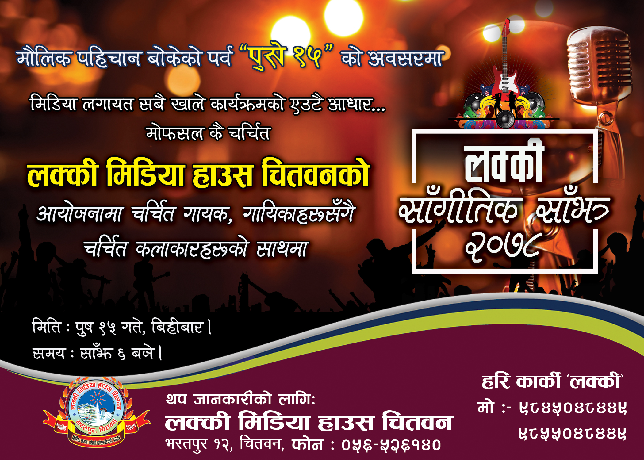 मोफसलकै चर्चित लक्की मिडिया हाउस चितवनले यही आउंँदो पुष १५ गते भरतपुरमा लक्की सांगितक सांँझ गर्ने भएको छ । कोरोनाले धराशायी भएको कलाकारिता क्षेत्रलाई उकास्ने र प्रर्वद्धन गर्ने हेतुले मिडिया हाउसले ‘लक्की सांगितिक सांँझ २०७८’ गर्न लागेको हो ।