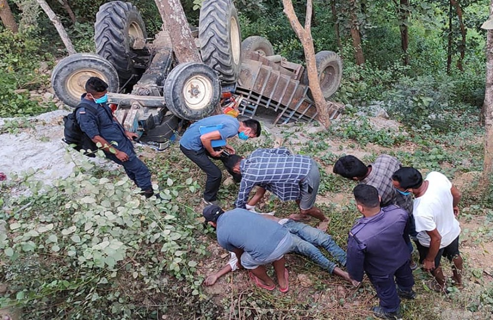 उदयपुरको त्रियुगा नगरपालिका-१ जोगिदह रुपनीमा खेत जोतेर आउँदै गरेको ट्याक्टर पल्टिँदा एक बालकको ज्यान गएको छ ।खेत जोतेर घर आउँदै गरेको स१त ४२९३ नम्बरको ट्याक्टर पल्टिएर घाइते भएको त्रियुगा नगरपालिका-१ रुपनीका सत्यनारायण चौधरीका १० वर्षीय छोरा नितेश चौधरीको जिल्ला अस्पताल गाईघाटमा उपचारको क्रममा ज्यान गएको हो ।शनिबार राति ८ बजेतिर खेत जोतेर छोराहरूलाई लिएर आउँदै गरेको ट्याक्टर घर नजिकै पल्टिँदा चालक बुबा सत्यनारायण चौधरी, अर्का छोरा १२ वर्षीय निमिष चौधरी घाइते भएको जिल्ला प्रहरी कार्यालय उदयपुरका सूचना अधिकारी तथा प्रहरी नायब उपरीक्षक वेदप्रसाद गौतमले जानकारी दिए ।