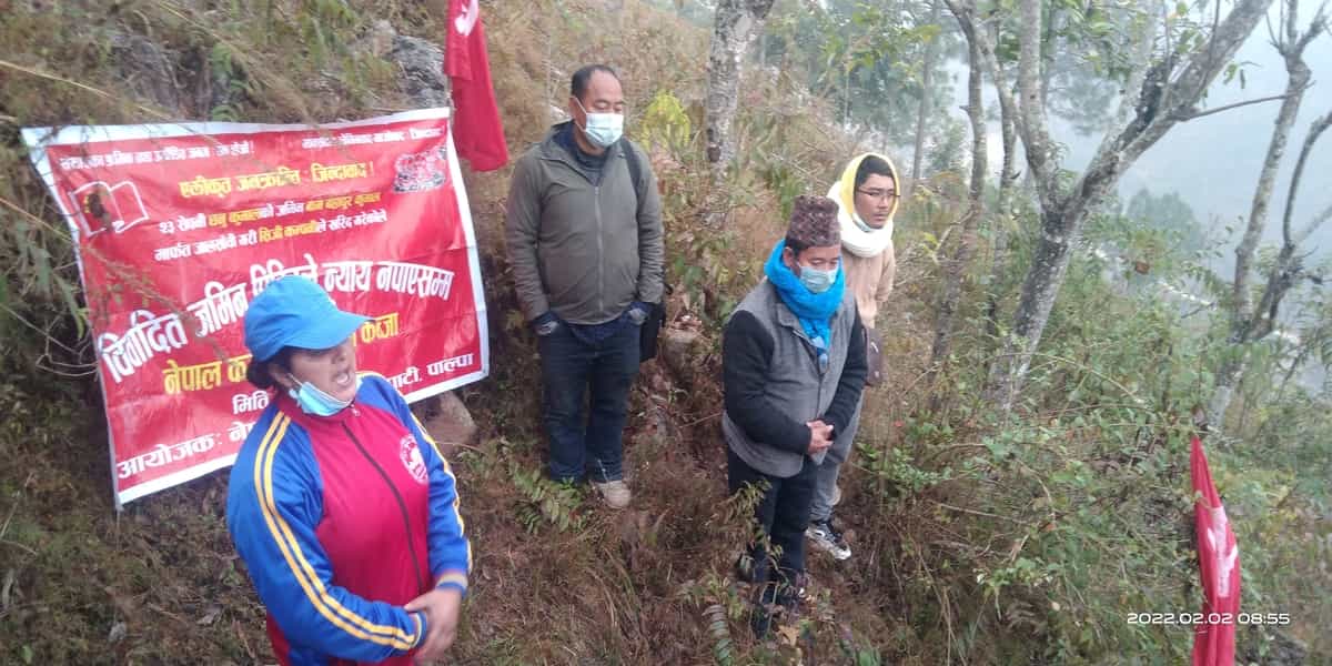नेपाल कम्युनिस्ट पार्टी पाल्पाले आज सिजि कम्पनीको २३ रोपनी जग्गा कब्जा गरेको छ । पाल्पाको रिब्दिकोट गाउँपालिका वडा नम्बर १ जैथुम देउलेफलाटमा रहेको सिजि कम्पनीको चुन उत्खनन जग्गा विवादित भएको भन्दै कब्जा गरेको हो ।