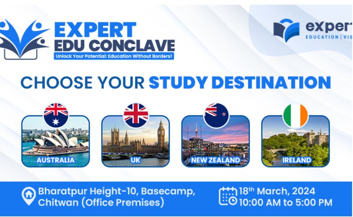 एक्सपर्ट एजुकेशन एण्ड भिजा सर्भिसेजको आयोजनामा भरतपुर–१०, स्थित एक्सपर्ट बेस क्याम्पमा चैत ५ गते (सोमबार) एक्सपर्ट एजुकेशन कन्क्लेभ हुन लागेको हो । कार्यक्रम विहान १० बजेदेखि अपरान्ह ५ बजेसम्म चल्नेछ । यस कन्क्लेभमा अष्ट्रेलिया, युके, न्यूजील्याण्ड र आयरल्याण्डका विश्वविद्यालय तथा कलेजका प्रतिनिधिहरुबाट विद्यार्थीहरुले प्रत्यक्ष रुपमा परामर्श पाउने छन् । विश्वविद्यालय तथा कलेजका प्रतिनिधिहरु आउँदा विद्यार्थी तथा अभिभावकहरुले आफूसंग सबै जिज्ञाशाको समाधान पाउने छन् । त्यसले गर्दा वैदेशिक शिक्षा सहज हुने एक्सपर्टको विश्वास छ ।